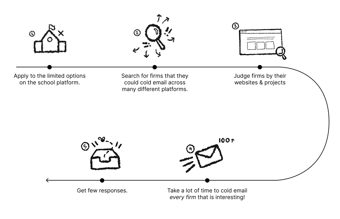 The internship application process for architecture students often does not rely on traditional job application platforms, like Indeed or LinkedIn, but instead on searching for firms to apply to across several platforms and cold emailing by volume.
