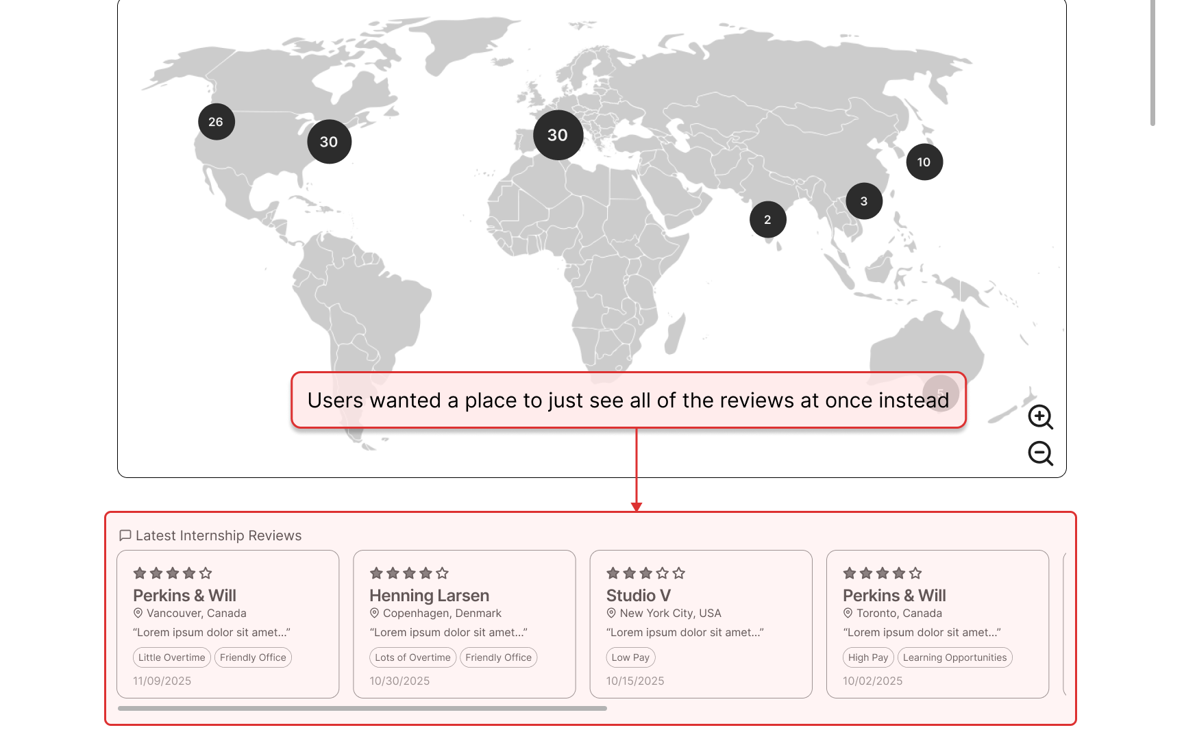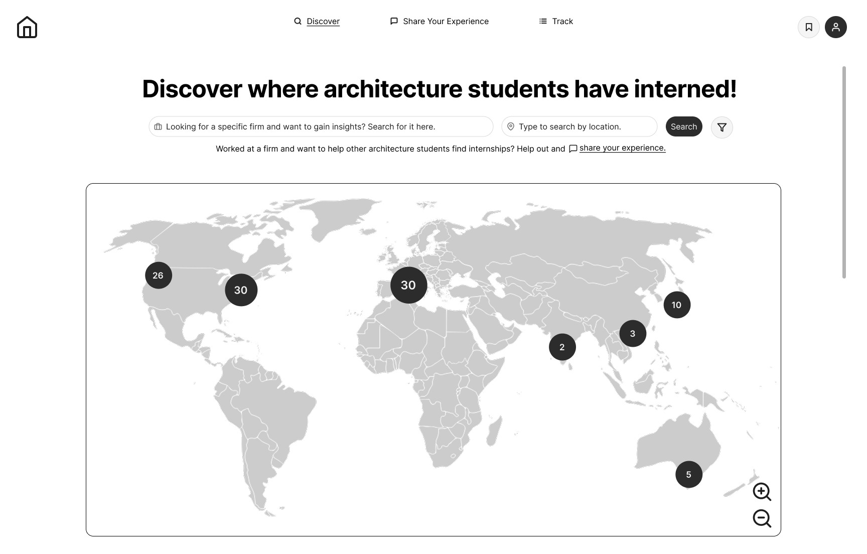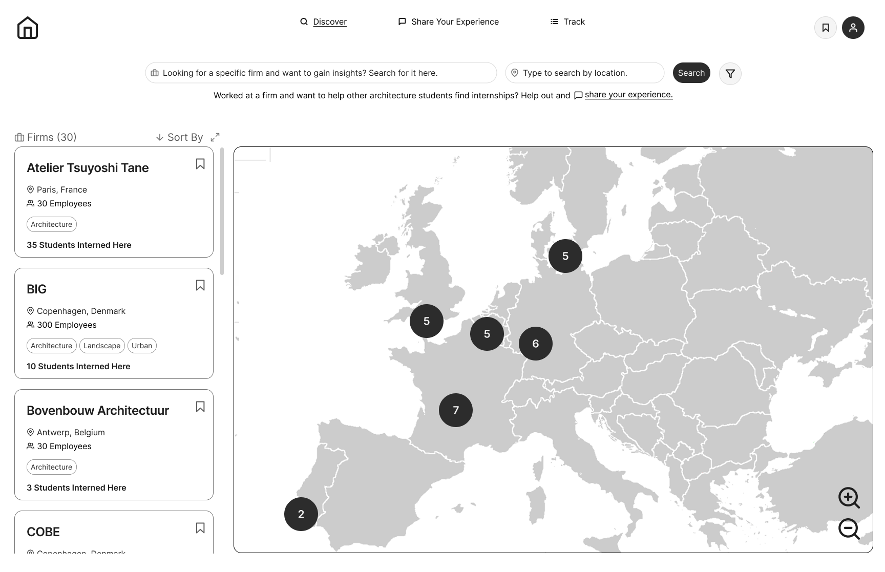 Internships allow architecture students to try living in new places and learn about architecture, landscape design, and urban planning through physically being in new environments. From user interviews, the location of an internship was consistently highlighted as the most important criterion when searching for firms to apply for.