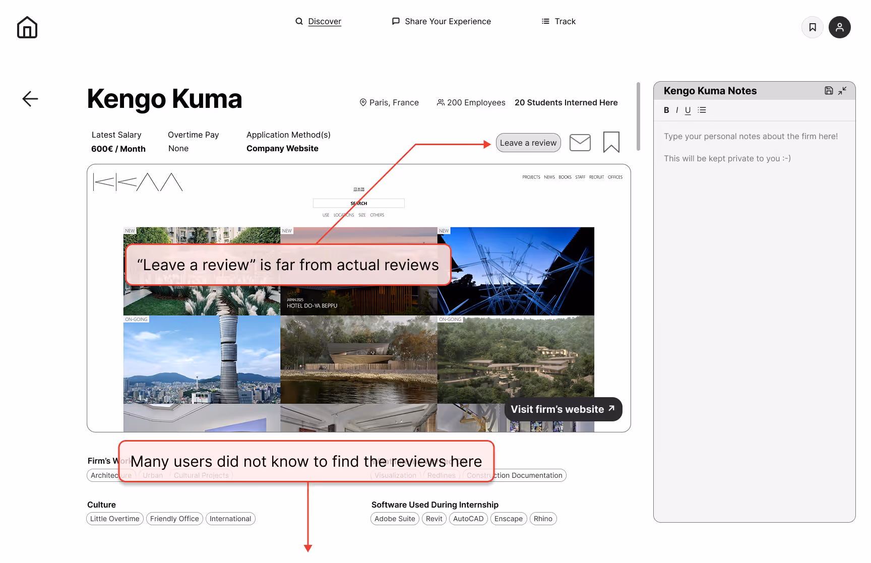 While reviews were central to providing insights to architecture students, users often found them hard to find. The navigation and information hierarchy on the pages were improved to highlight the reviews.